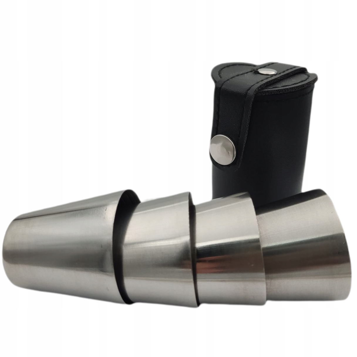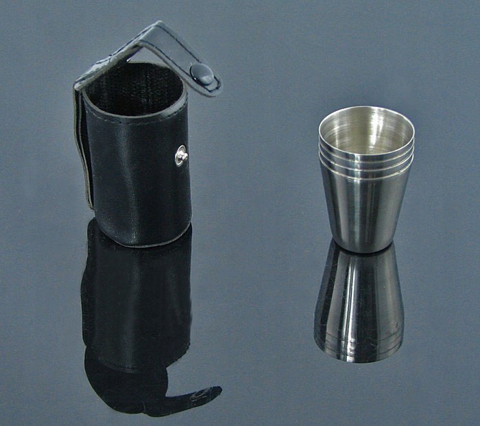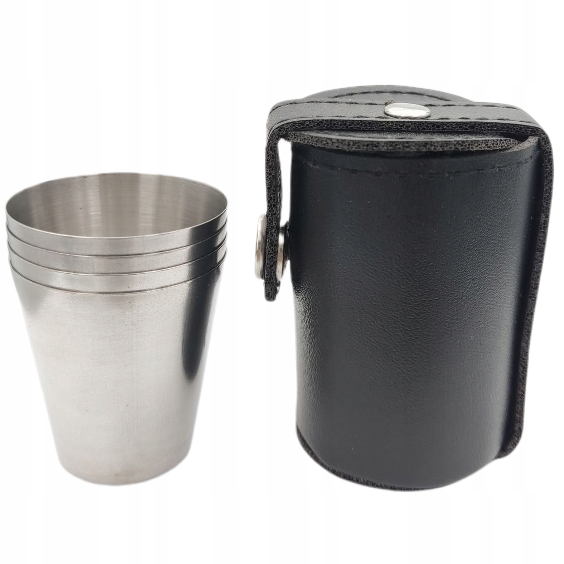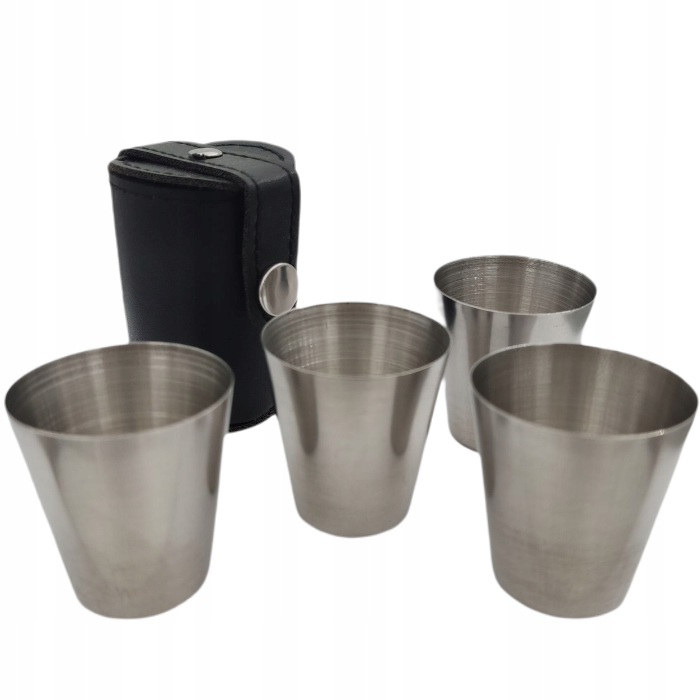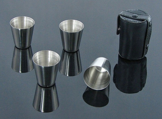 Zestaw 4 metalowych kieliszków turystycznych, pakowanych w eleganckie etui.