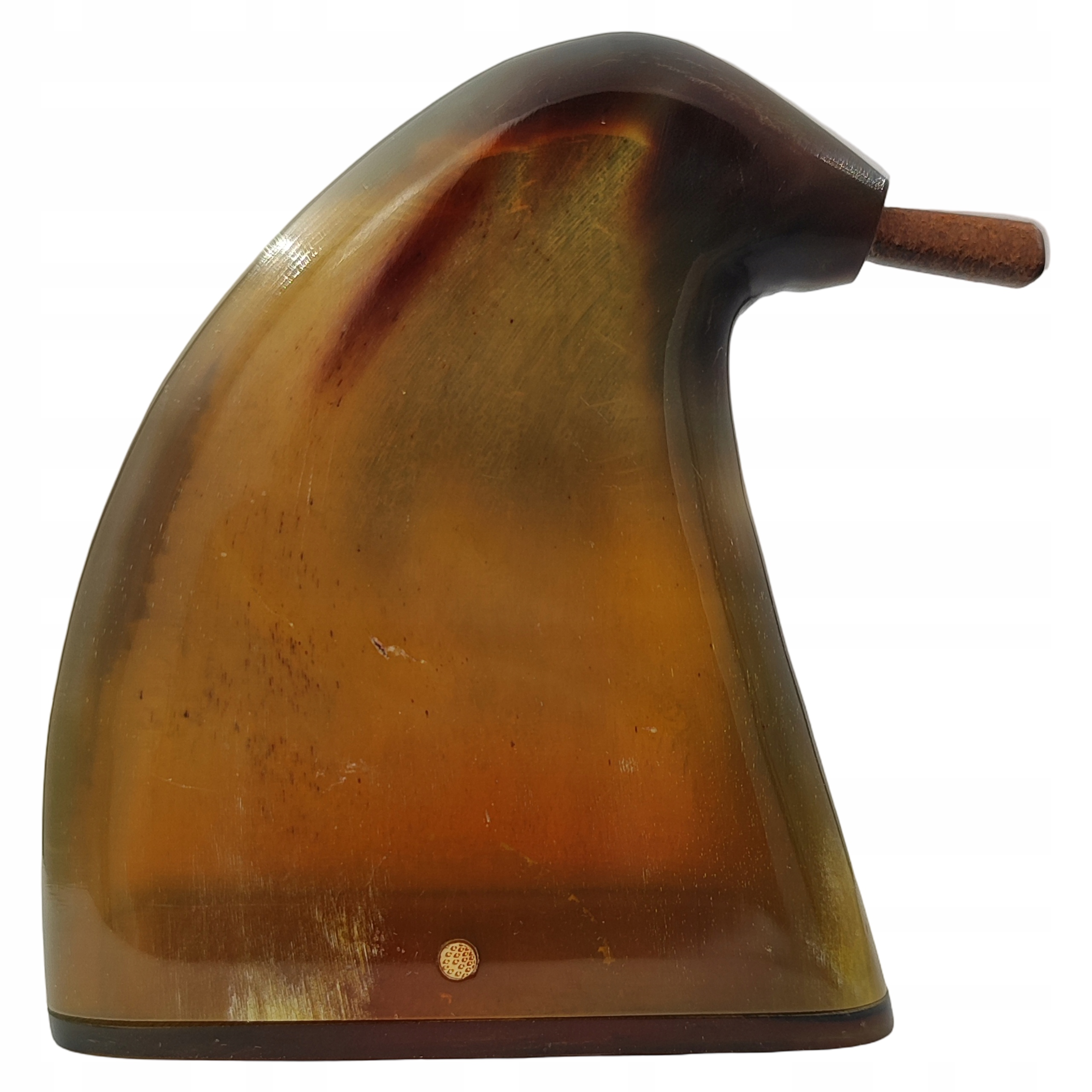 Spód tabakiery został również wykonany z rogu, aby go otworzyć należy wypchnąć drewnianą zatyczkę, która znajduje się z boku. Na górze tabakierki znajduje się skórzana zatyczka.